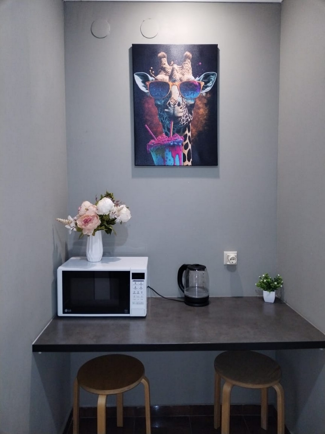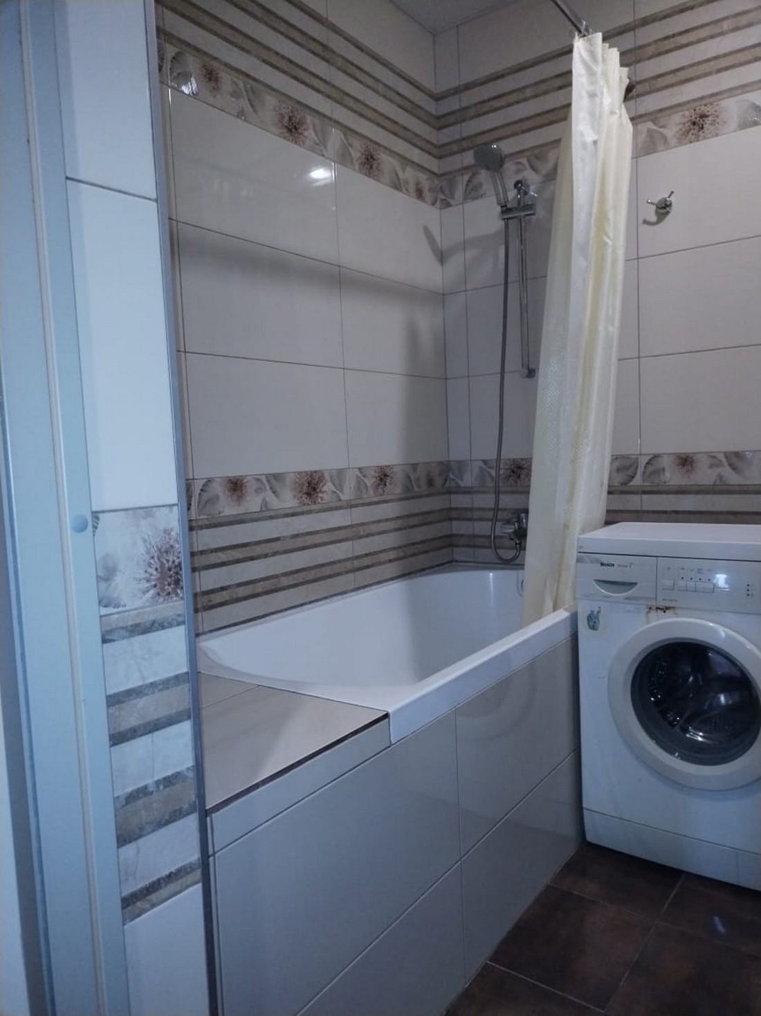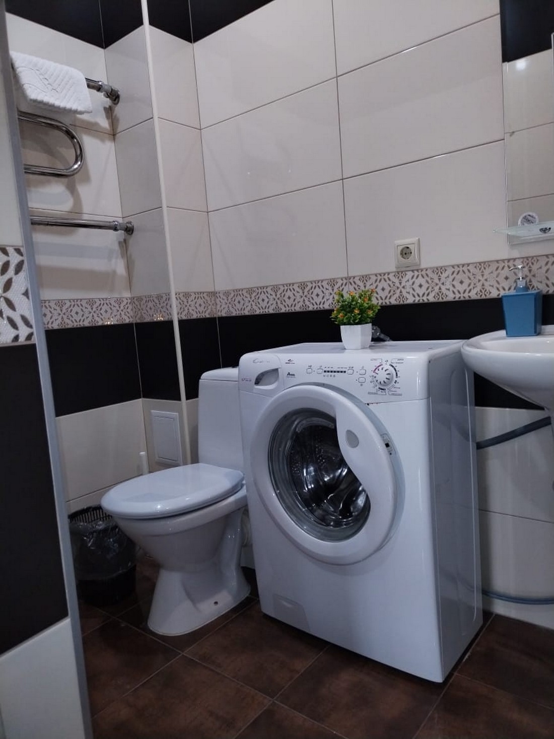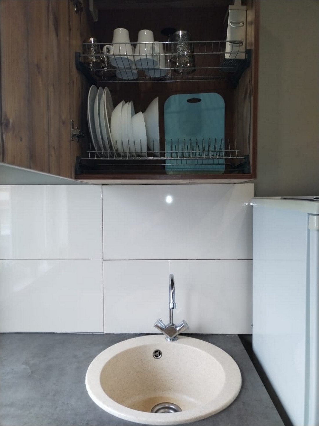 Имеется телевизор, кондиционер, шкаф, вешалка обеденный стол, рабочий стол, комод, журнальный столик, стулья, кухня, посуда, столовые приборы, СВЧ, чайник, холодильник, электрическая плита, фен, стиральная машина, сушилка для белья.